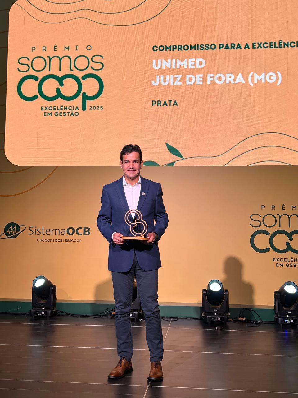A Unimed Juiz de Fora acaba de conquistar o troféu prata na categoria “Compromisso com a Excelência” do Prêmio SomosCoop Excelência em Gestão 2025, promovido pelo Serviço Nacional de Aprendizagem do Cooperativismo (Sescoop). O reconhecimento é concedido a cooperativas brasileiras participantes do Programa de Desenvolvimento da Gestão Cooperativa (PDGC) que se destacam pela adoção de boas práticas de governança. A cerimônia de premiação aconteceu na última terça-feira (9/12), em Brasília, onde estiveram presentes o presidente da Unimed Juiz de Fora, Dr. Cláudio Reiff, e o superintendente Executivo, Bruno Esteves.